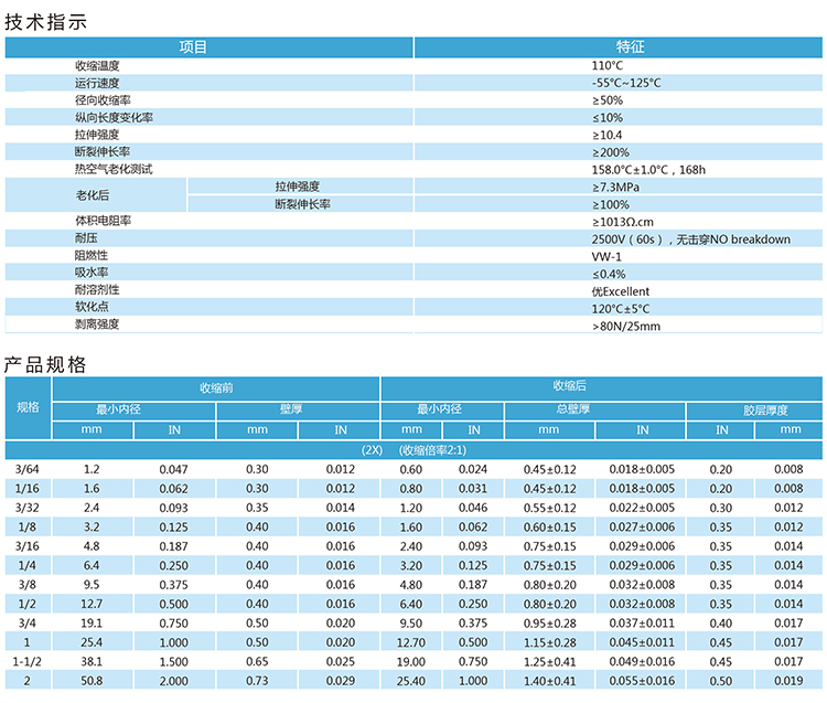 材料:外層:交聯(lián)改性聚烯樹脂內層:熱熔性粘接劑收縮倍(bèi)率: 2:1 3:1 4:1特點:◆柔軟,阻燃。環保;◆優異的防水、防潮性能;◆最低收縮溫度:80°C,最低完(wán)全收縮(suō)溫度:125°C◆滿足UL224標準,並(bìng)能(néng)通過VW-1阻(zǔ)燃等級,應用領域:適(shì)用於電子設備的接線防水、電線分支出的(de)密封固定、金屬管線(xiàn)的防腐保護,以及防止由高(gāo)分子鏈鬆弛產生的鬆動和脫落,如水下(xià)燈飾、汽車(chē)油管、船舶、高級線束等。